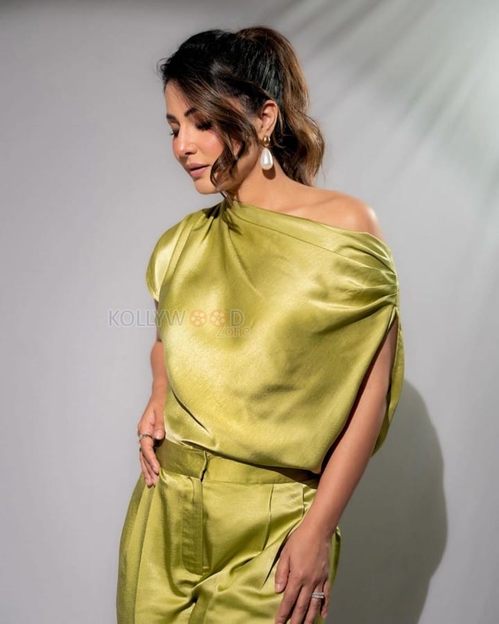 You are viewing an image of Actress Hina Khan in a Lime Green Satin Jumpsuit Pictures 01 in KollywoodZone.com Photo Gallery