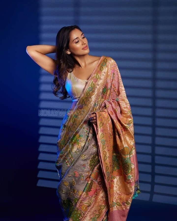 Stunning Nikita Dutta in a Pre Draped Mud Green and Gold Saree with a Sequined Sleeveless Blouse Photos 01