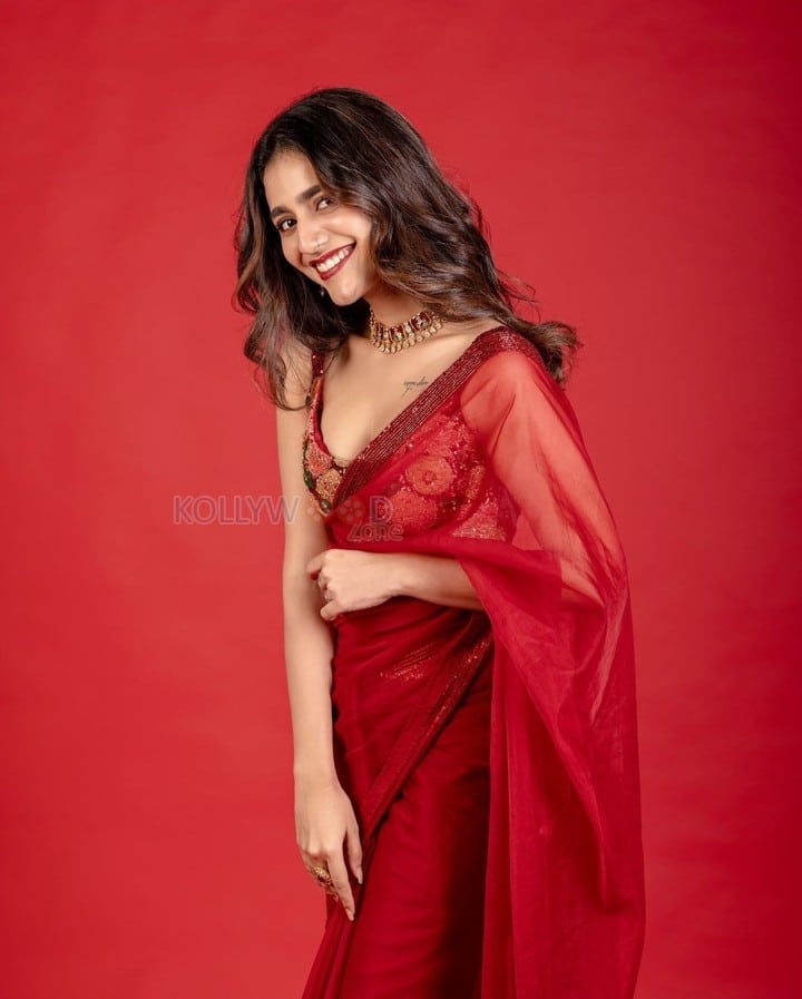 You are viewing a picture of Beautiful Priya Prakash Varrier in a Glam Red Saree with a Sleeveless Blouse Pictures 02 in KollywoodZone.com Photo Gallery.