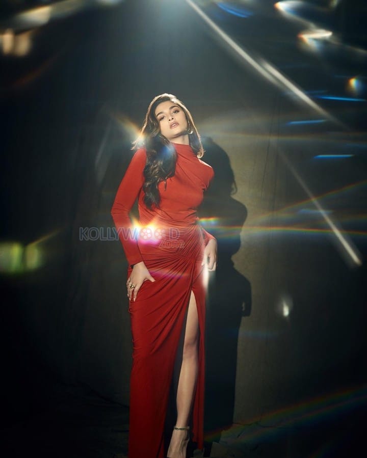 You are viewing an image of Beautiful Saiee Manjrekar in a Red Long Gown with a Thigh Slit and High Neckline Photos 08 in KollywoodZone.com Photo Gallery
