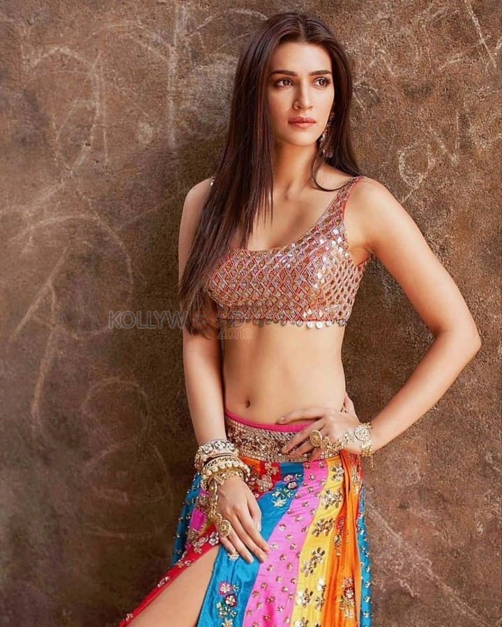 You are viewing an image of Bollywood Heroine Kriti Sanon in a Multicolor Printed Skirt and Short Sleeveless Blouse Photo 01 in KollywoodZone.com Photo Gallery