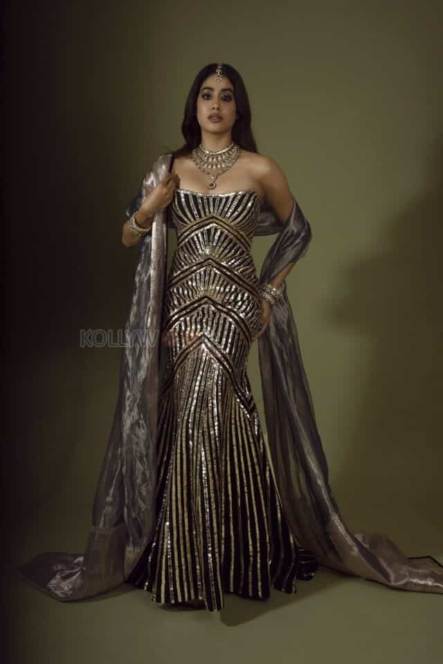 Seductive Janhvi Kapoor in a Gilded Goddess Strapless with Corseted Bodice and Mermaid Silhouette Gown Pictures 01