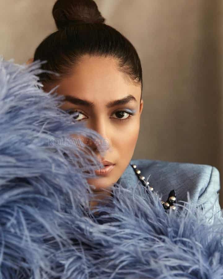You are viewing an image of Captivating Mrunal Thakur in a Furry Blue Pantsuit Pictures 03 in KollywoodZone.com Photo Gallery