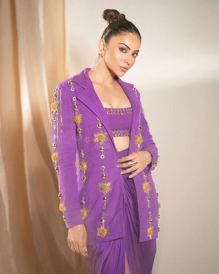 You are viewing an image of Dazzling Rakul Preet Singh in a Purple Silk Blazer with Thigh Slit Skirt Photos 01 in KollywoodZone.com Photo Gallery