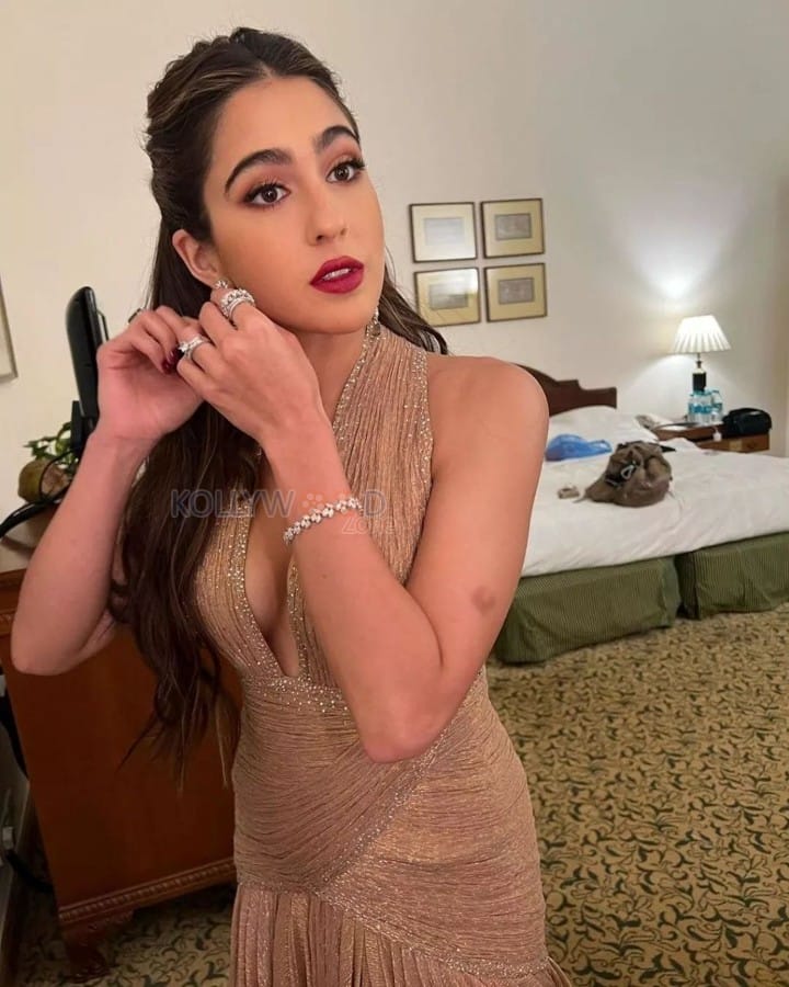 You are viewing a picture of Dazzling Sara Ali Khan in a Sequined Tarun Tahiliani Rose Gold Embellished Halter Neck Gown Photos 02 in KollywoodZone.com Photo Gallery.