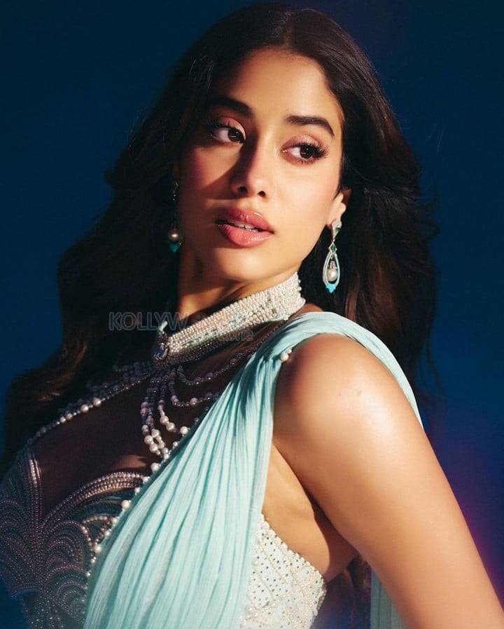 You are viewing a picture of Devara Heroine Janhvi Kapoor in a Ice Blue Saree and Jewelled Blouse Photos 01 in KollywoodZone.com Photo Gallery.