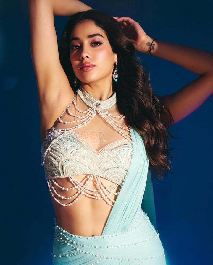 You are viewing an image of Devara Heroine Janhvi Kapoor in a Ice Blue Saree and Jewelled Blouse Photos 02 in KollywoodZone.com Photo Gallery