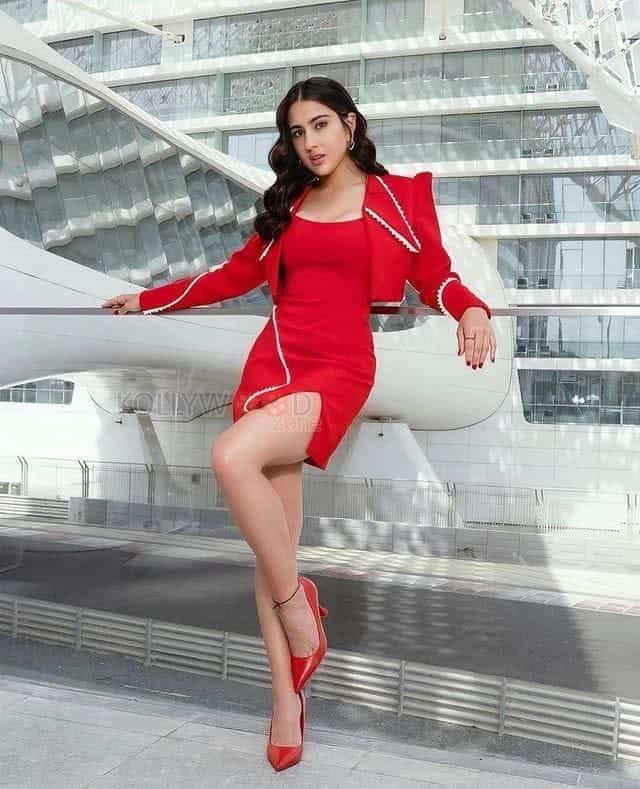 You are viewing an image of Diva Sara Ali Khan in a Chic Red Mini Dress Photoshoot Pictures 03 in KollywoodZone.com Photo Gallery