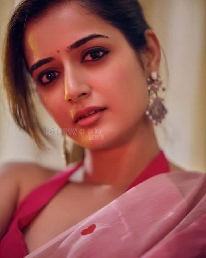 You are viewing an image of Elegant Ashika Ranganath in a Pink Saree with Red Heart Motifs Photoshoot Pictures 08 in KollywoodZone.com Photo Gallery