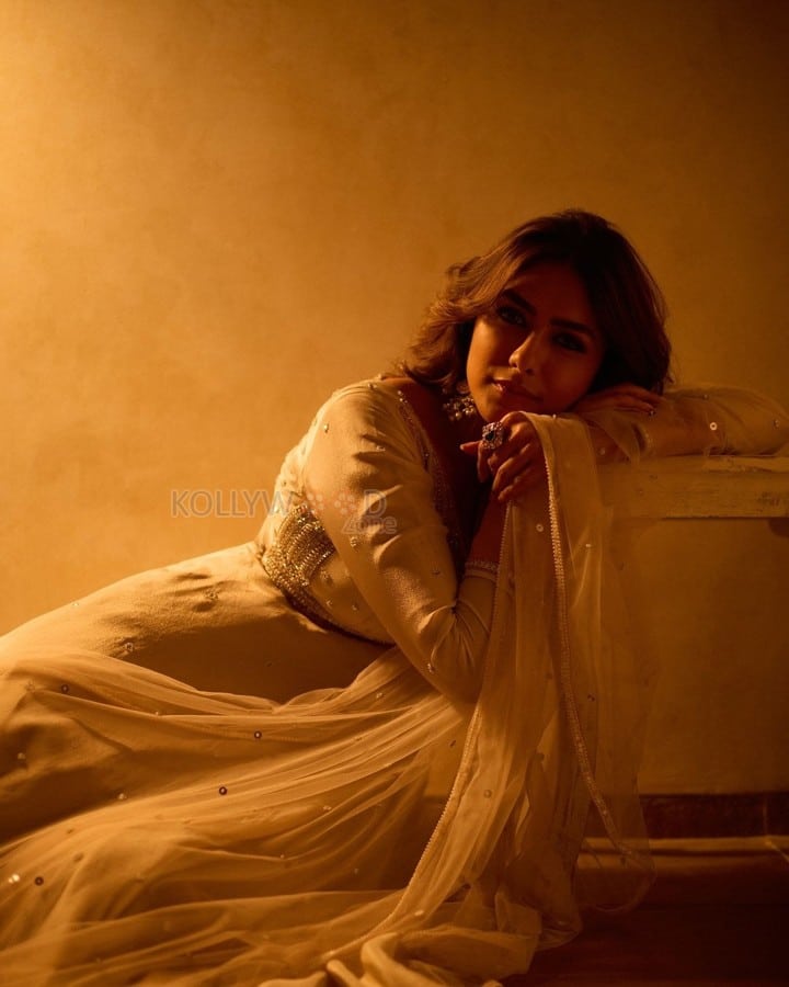 You are viewing a picture of Elegant Mrunal Thakur in a Traditional Cream White Anarkali Suit Photos 07 in KollywoodZone.com Photo Gallery.