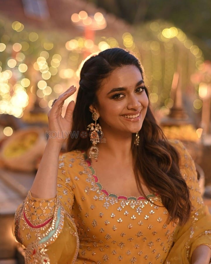 You are viewing a picture of Gorgeous Keerthy Suresh in a Yellow Sharara with U Neckline Pictures 02 in KollywoodZone.com Photo Gallery.