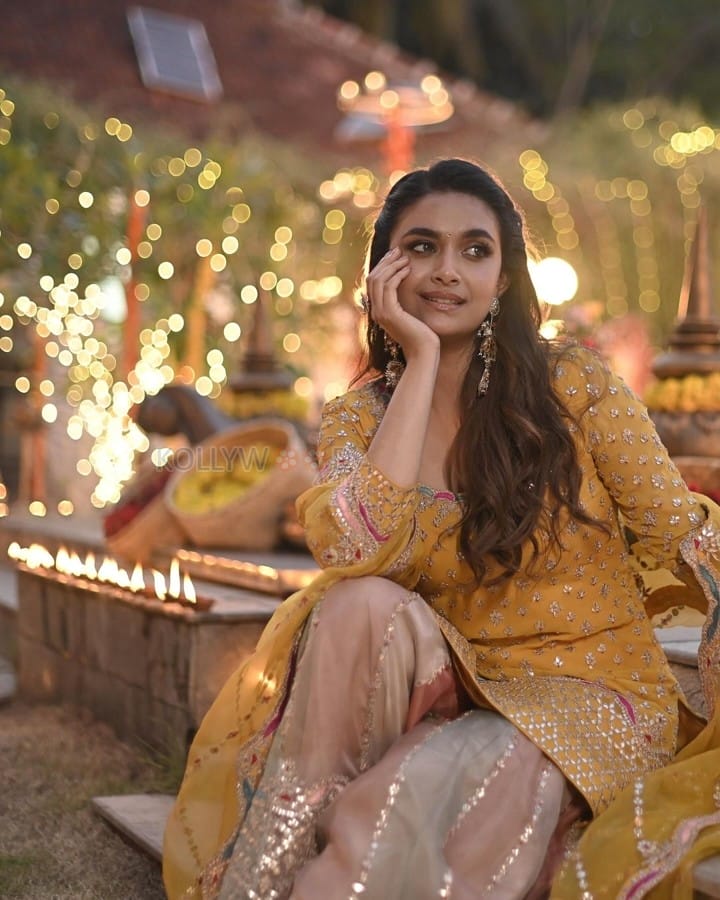 You are viewing a picture of Gorgeous Keerthy Suresh in a Yellow Sharara with U Neckline Pictures 04 in KollywoodZone.com Photo Gallery.