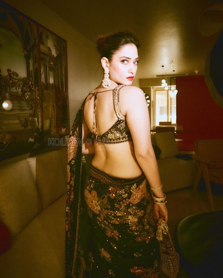 You are viewing a picture of Milky Babe Tamannaah Bhatia in a Backless Black Saree at Randeep Hooda and Lin Laishram Mumbai Wedding Celebration Photos 08 in KollywoodZone.com Photo Gallery.