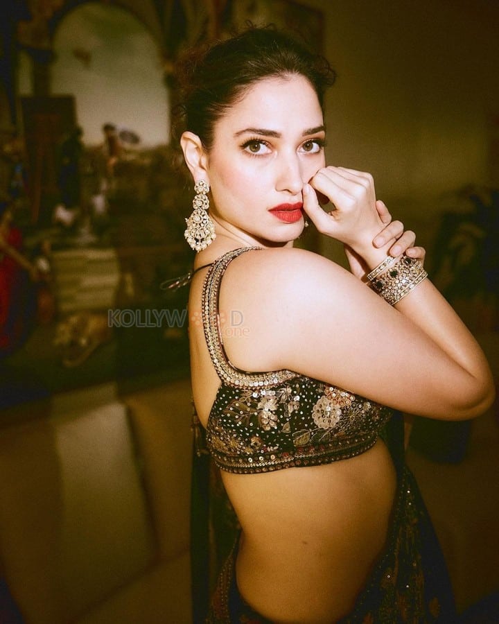 You are viewing a picture of Milky Babe Tamannaah Bhatia in a Backless Black Saree at Randeep Hooda and Lin Laishram Mumbai Wedding Celebration Photos 09 in KollywoodZone.com Photo Gallery.