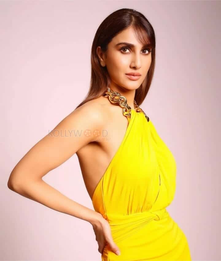 You are viewing a picture of Model Vaani Kapoor in a Yellow Drape Dress Photos 01 in KollywoodZone.com Photo Gallery.