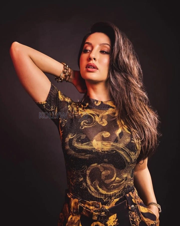You are viewing an image of Nora Fatehi in a Versace Yellow Gold Co Ord Set Photos 02 in KollywoodZone.com Photo Gallery