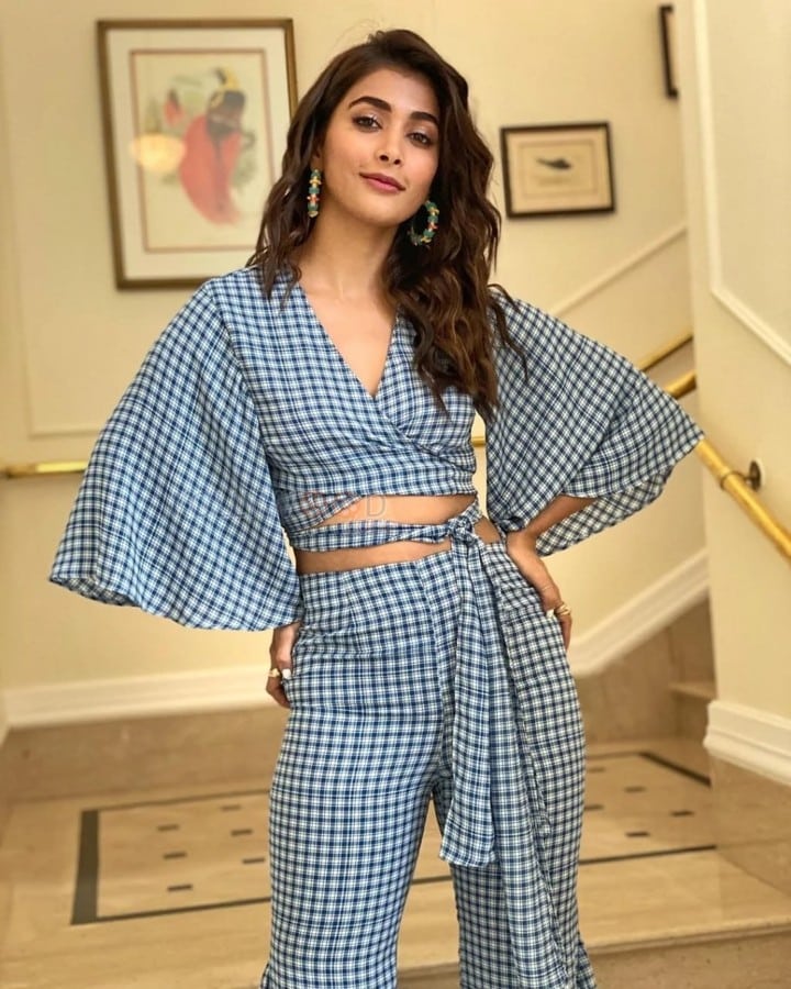 You are viewing a picture of Playful Pooja Hegde in a Blue ish Grey Co ord Set Photos 02 in KollywoodZone.com Photo Gallery.