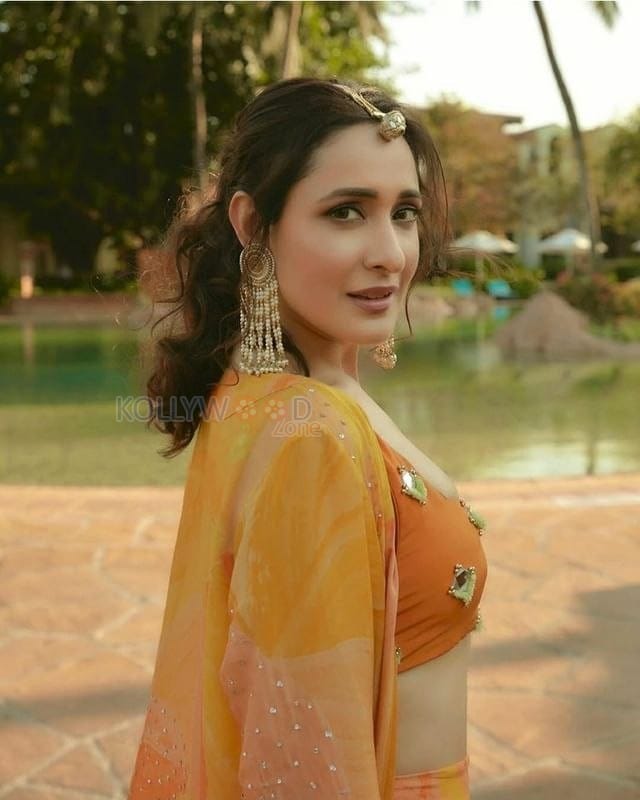 You are viewing a picture of Pragya Jaiswal in an Orange Lehenga with Mirror Blouse Pictures 02 in KollywoodZone.com Photo Gallery.