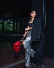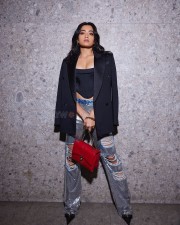 Stylish Rashmika Mandanna in a Black Corset and Blazer with a Rugged Jeans at Versace Milan Show Photos 02