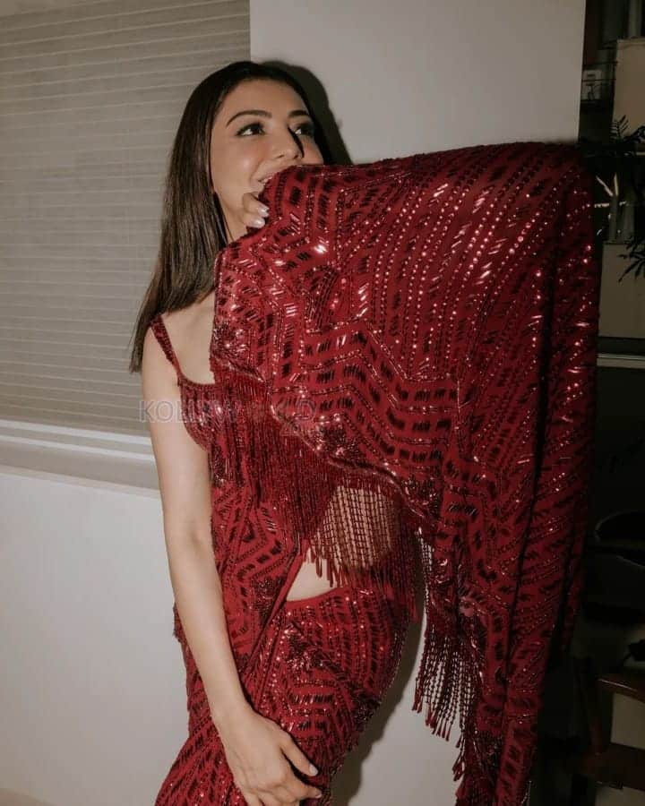 You are viewing an image of Ravishing Kajal Aggarwal in a Shiny Red Saree Photos 03 in KollywoodZone.com Photo Gallery