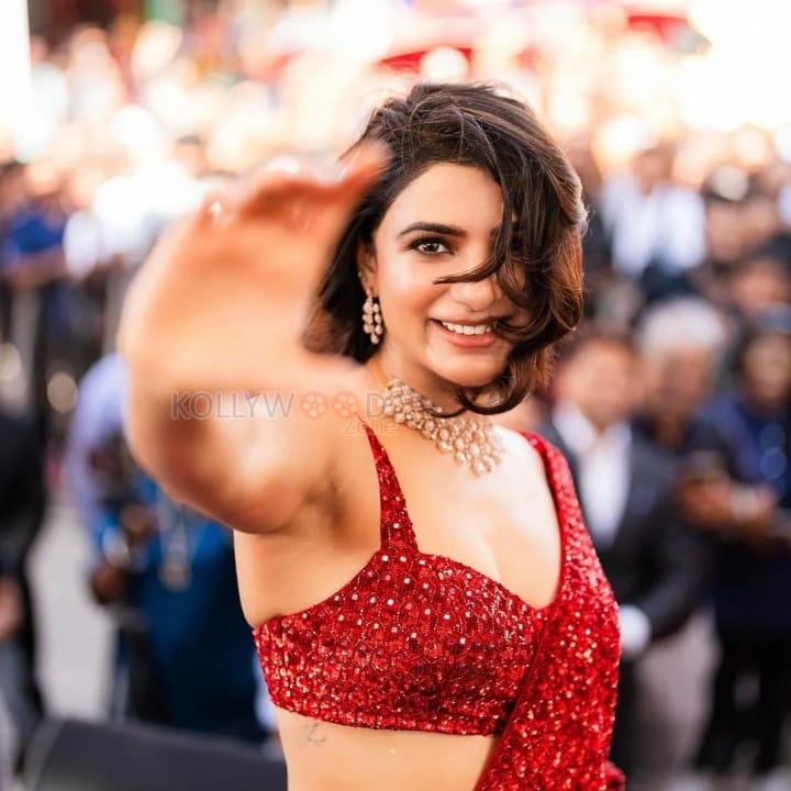 You are viewing a picture of Samantha Ruth Prabhu in a Red Sequin Embroidered Saree and Blouse Photos 03 in KollywoodZone.com Photo Gallery.