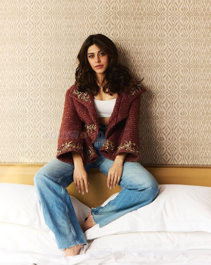 You are viewing an image of Sexy Alaya F in a White Crop Top and Blue Denim on the Bed Photos 03 in KollywoodZone.com Photo Gallery
