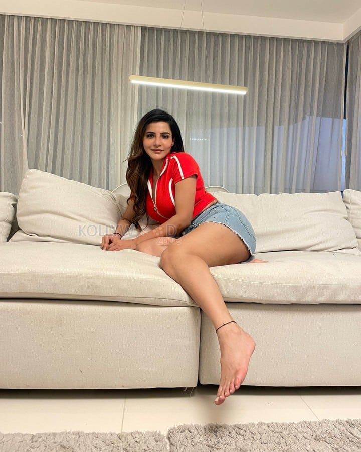 You are viewing an image of Sexy Ashu Reddy in a Red Crop Top and Mini Denim Shorts Photos 02 in KollywoodZone.com Photo Gallery