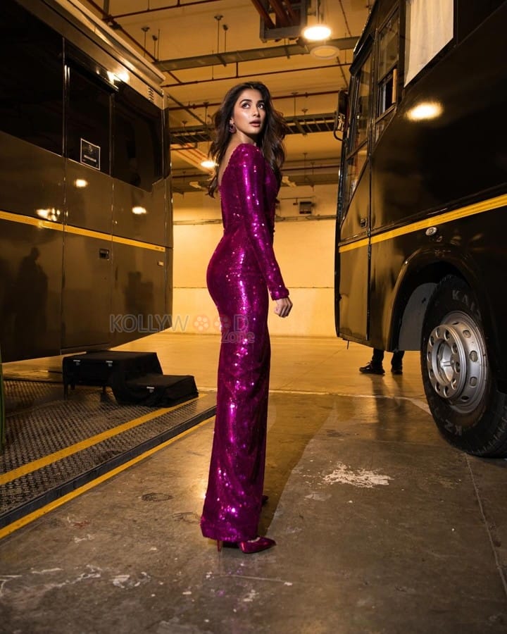 You are viewing an image of Sexy Pooja Hegde in a Dark Pink Embellished Long Dress Photos 03 in KollywoodZone.com Photo Gallery