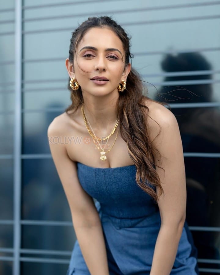 You are viewing a picture of Sexy Rakul Preet Singh in a Denim Strapless Top with Cargo Pants Photos 01 in KollywoodZone.com Photo Gallery.