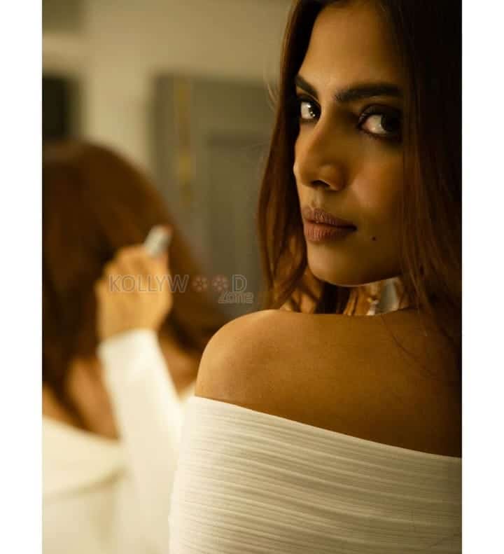 You are viewing a picture of Striking Beauty Malavika Mohanan in a White Off Shoulder Dress Photos 02 in KollywoodZone.com Photo Gallery.