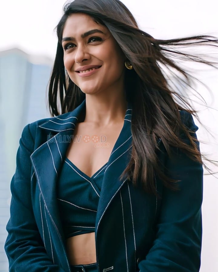 You are viewing a picture of Stylish Mrunal Thakur in a Blue Blazer Suit with a Matching Bralette Photos 02 in KollywoodZone.com Photo Gallery.