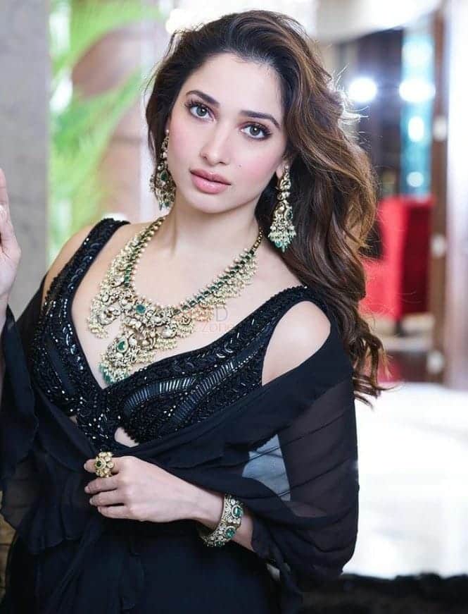 You are viewing a picture of Tamannaah Bhatia in a Stylish Black Party Wear Saree Photo 01 in KollywoodZone.com Photo Gallery.