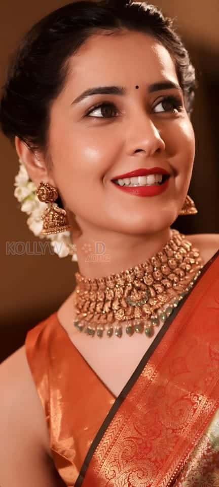 You are viewing an image of Actress Raashi Khanna in a Brown Silk Saree wearing a Matching Choker Set Photos 02 in KollywoodZone.com Photo Gallery
