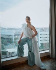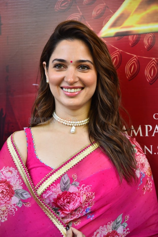 Actress Tamannah Bhatia in a Pink Floral Printed Saree with a Sleeveless Blouse at Odela 2 Movie Press Meet Stills 04
