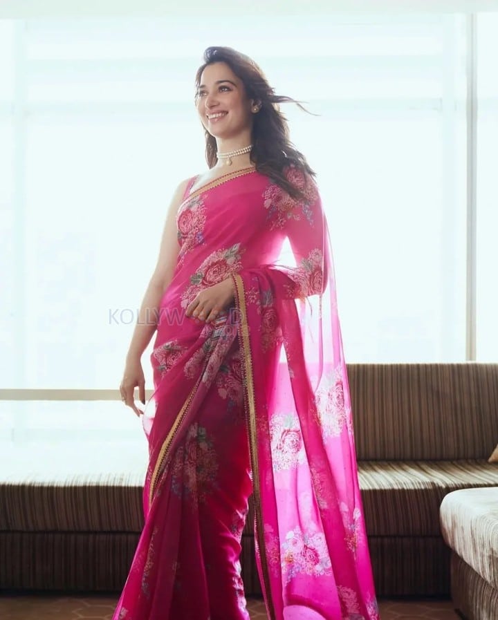 You are viewing an image of Actress Tamannah Bhatia in a Pink Floral Printed Saree with a Sleeveless Blouse at Odela 2 Movie Press Meet Stills 06 in KollywoodZone.com Photo Gallery