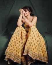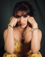 Stylish Heroine Sreeleela in an Mustard Yellow Printed Strapless Corset Top with a Midi Length Skirt Photos 04