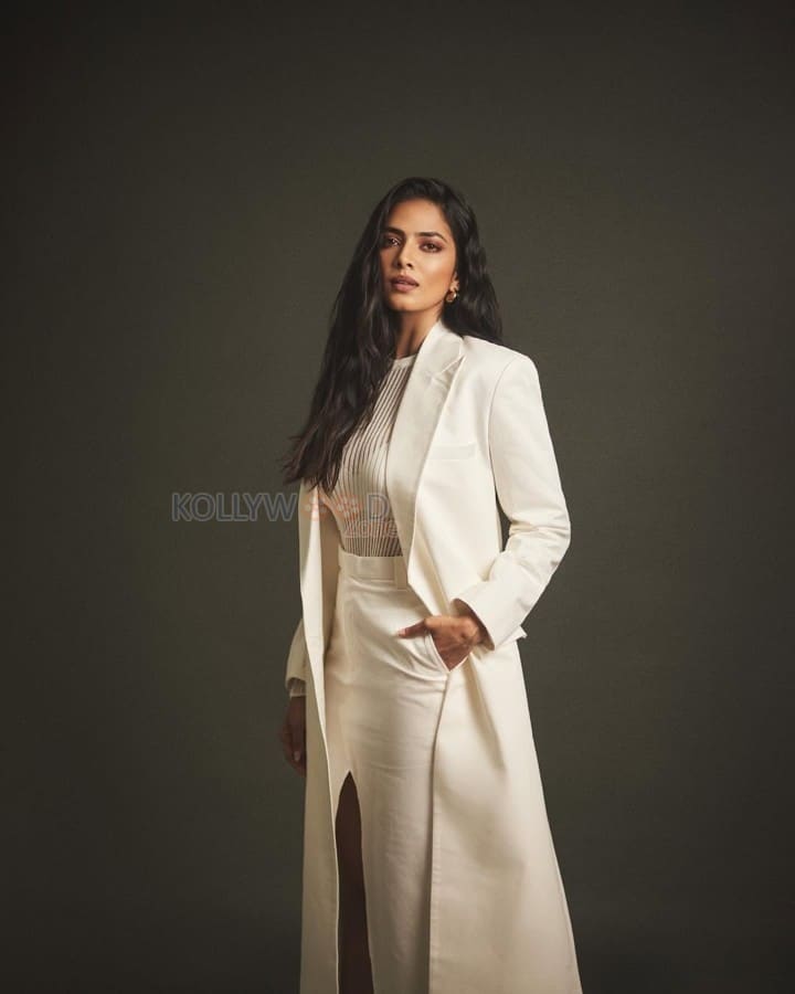 You are viewing an image of Beautiful Malavika Mohanan in an Off White Bralette with a See Through Top and Trench Coat with White Pants Photos 01 in KollywoodZone.com Photo Gallery