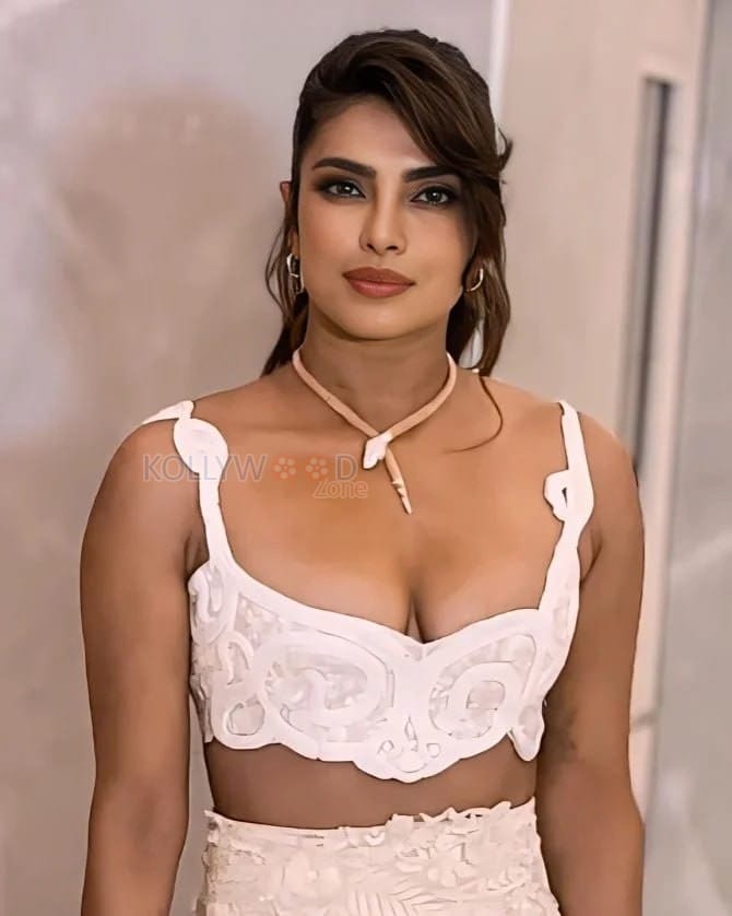 You are viewing an image of Bold Priyanka Chopra in a Plunging White Crochet Bralette Top with Matching Satin Pants Photos 04 in KollywoodZone.com Photo Gallery