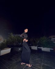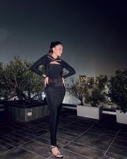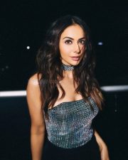 Stylish Hot Rakul Preet Singh in a Red Metallic Draped Dress with a Halterneck and Thigh Slit Photos 02