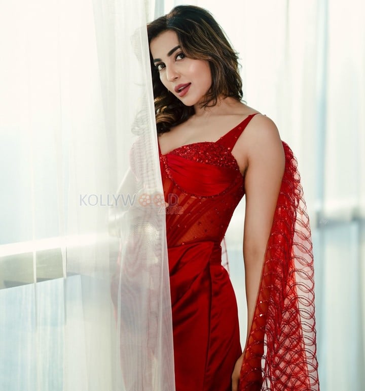 Classy Parvati Nair in a Red Netted Embroidered Sequin Blouse with a Matching Pant Set With Cape Photos 04