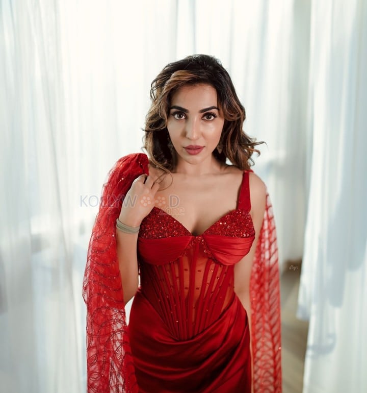 Classy Parvati Nair in a Red Netted Embroidered Sequin Blouse with a Matching Pant Set With Cape Photos 02