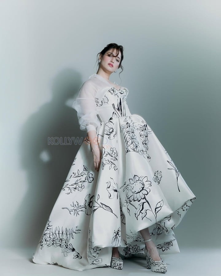 You are viewing an image of Dazzling Tamannaah Bhatia in a Stunning White Gown with Black Floral Illustrations Photos 08 in KollywoodZone.com Photo Gallery