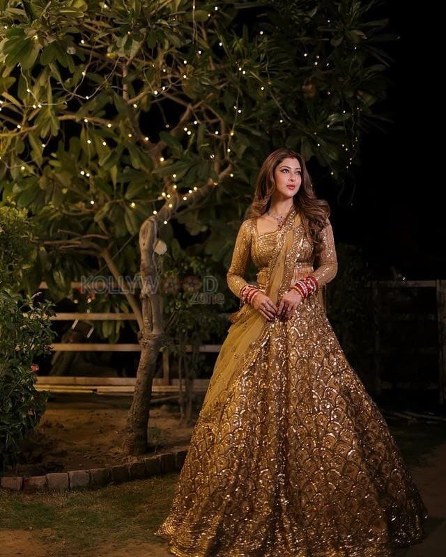 You are viewing an image of Devon Ke Dev Mahadev Actress Sonarika Bhadoria in a Golden Embroidered Square Neckline Blouse with a Matching Lehenga Skirt and Sheer Dupatta Pictures 04 in KollywoodZone.com Photo Gallery