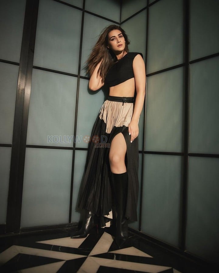You are viewing a picture of Do Patti Actress Kriti Sanon in a Black Crop Top and Black Cream Skirt Pictures 01 in KollywoodZone.com Photo Gallery.