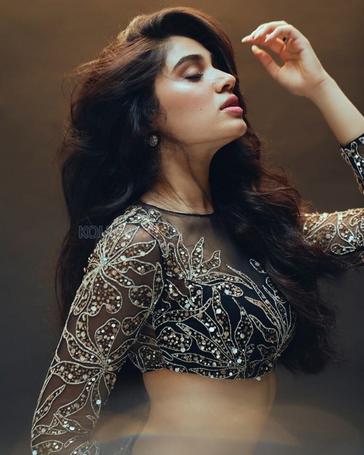 You are viewing an image of Glam and Gorgeous Krithi Shetty in a Silver and Black Daring Crop Top and Thigh Slit Skirt Photos 04 in KollywoodZone.com Photo Gallery