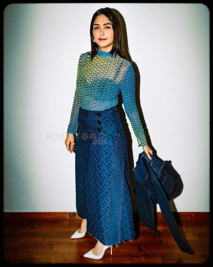 You are viewing a picture of Glamorous Mrunal Thakur in a Blue Mesh Top with Matching Skirt Pictures 07 in KollywoodZone.com Photo Gallery.