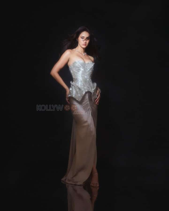 You are viewing a picture of Hot and Tempting Disha Patani in an Off Shoulder Silver Corset Sequin Silk Gown Photos 01 in KollywoodZone.com Photo Gallery.