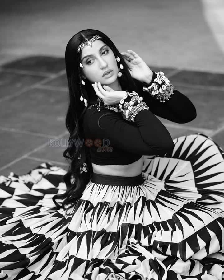 You are viewing a picture of Nora Fatehi in a Black and White Printed Lehenga Choli Photo 01 in KollywoodZone.com Photo Gallery.