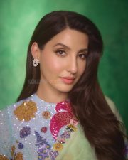Stunning Nora Fatehi in a Blue Floral Embroidered Saree with a Matching Sleeveless Blouse Pictures 07