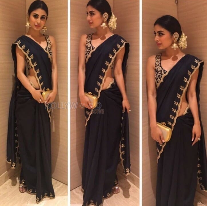 Sensational Beauty Mouni Roy in a Blue Sequin Embellished Saree with a Strapless Tube Blouse Pictures 03